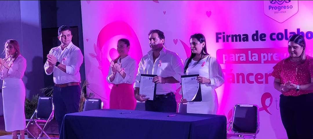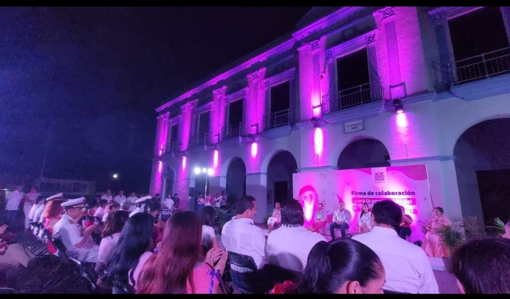 El alcalde de Progreso, Julián Zacarías encabeza el encendido de color rosa del Palacio Municipal acompańado de Alejandra Gutierrez, presidenta de la FundaciónTócate.