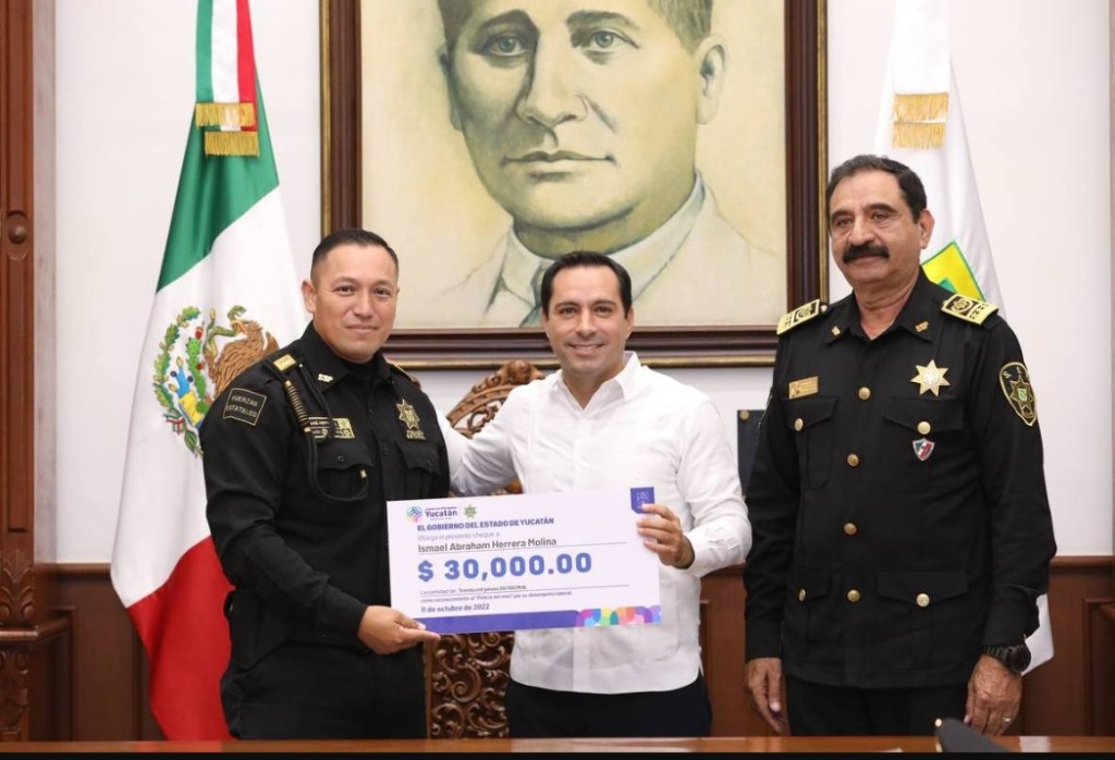 Mérida, Yucatán, 11 de octubre de 2022.- Por su compromiso, lealtad, valentía y destacado desempeño laboral al servicio de la población yucateca, el Gobernador Mauricio Vila Dosal entregó el reconocimiento de Policía del Mes a Ismael Abraham Herrera, agente primero con 13 años de antigüedad en la Secretaría de Seguridad Pública (SSP).