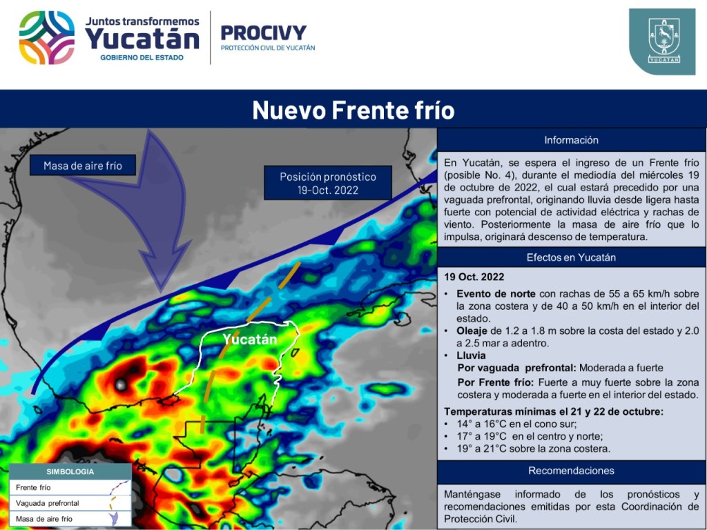 A partir de las instrucciones del titular del Ejecutivo estatal, Mauricio Vila Dosal, de informar de manera oportuna a la población sobre eventos hidrometeorológicos a fin de tomar medidas preventivas, el Sistema Estatal de Monitoreo y Alertamiento de Procivy reportó el ingreso del referido sistema frontal a partir del mediodía del 19 del presente mes.