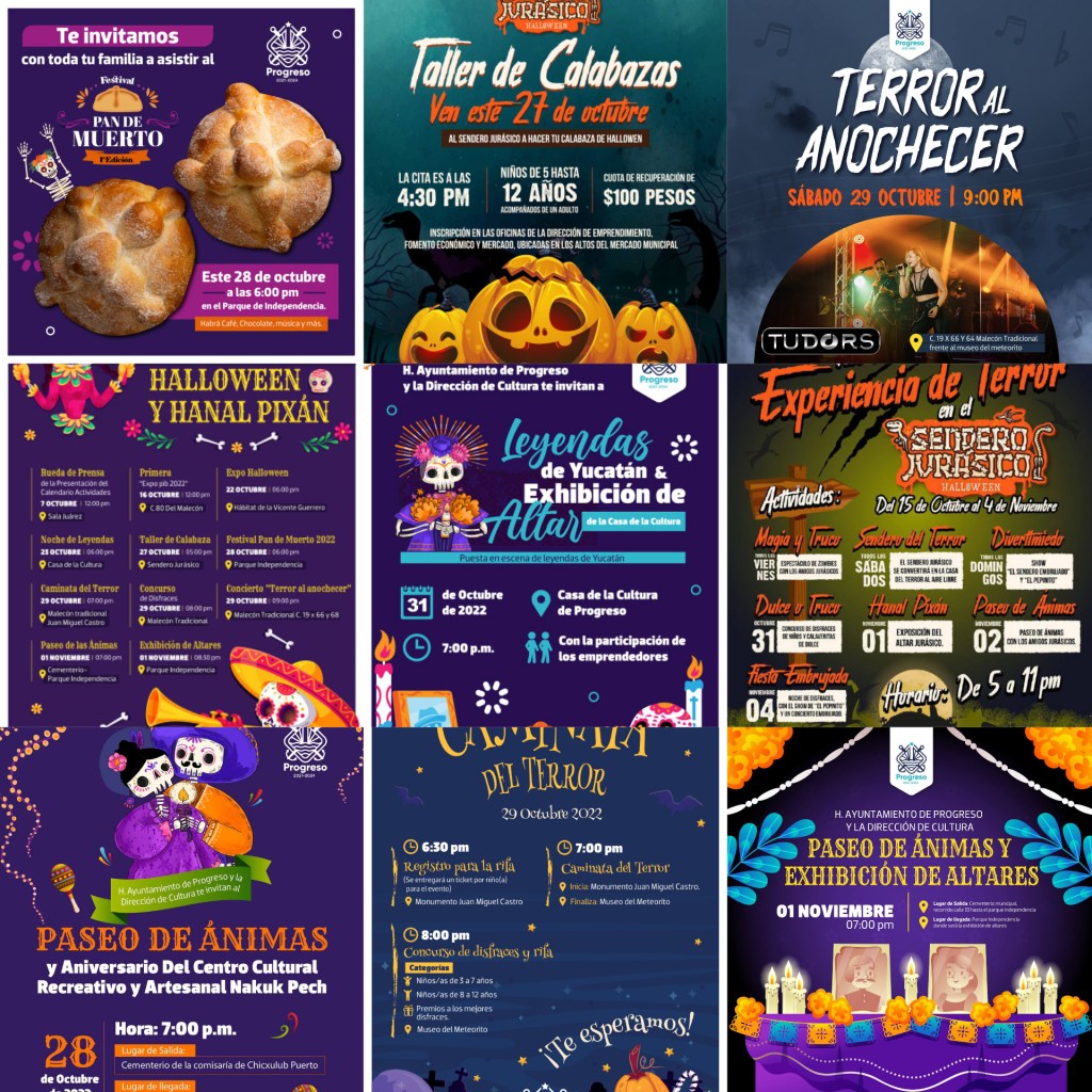 Progreso, Yucatán a 25 de octubre de 2022. El Puerto de Progreso tiene varias alternativas para que progreseños y visitantes disfruten en familia los días de finados, en ese sentido, el Ayuntamiento de Progreso comparte su calendario de actividades «Hanal PIxán y Halloween» que iniciará a partir de este jueves 27 de octubre y concluirá el viernes 04 de noviembre.