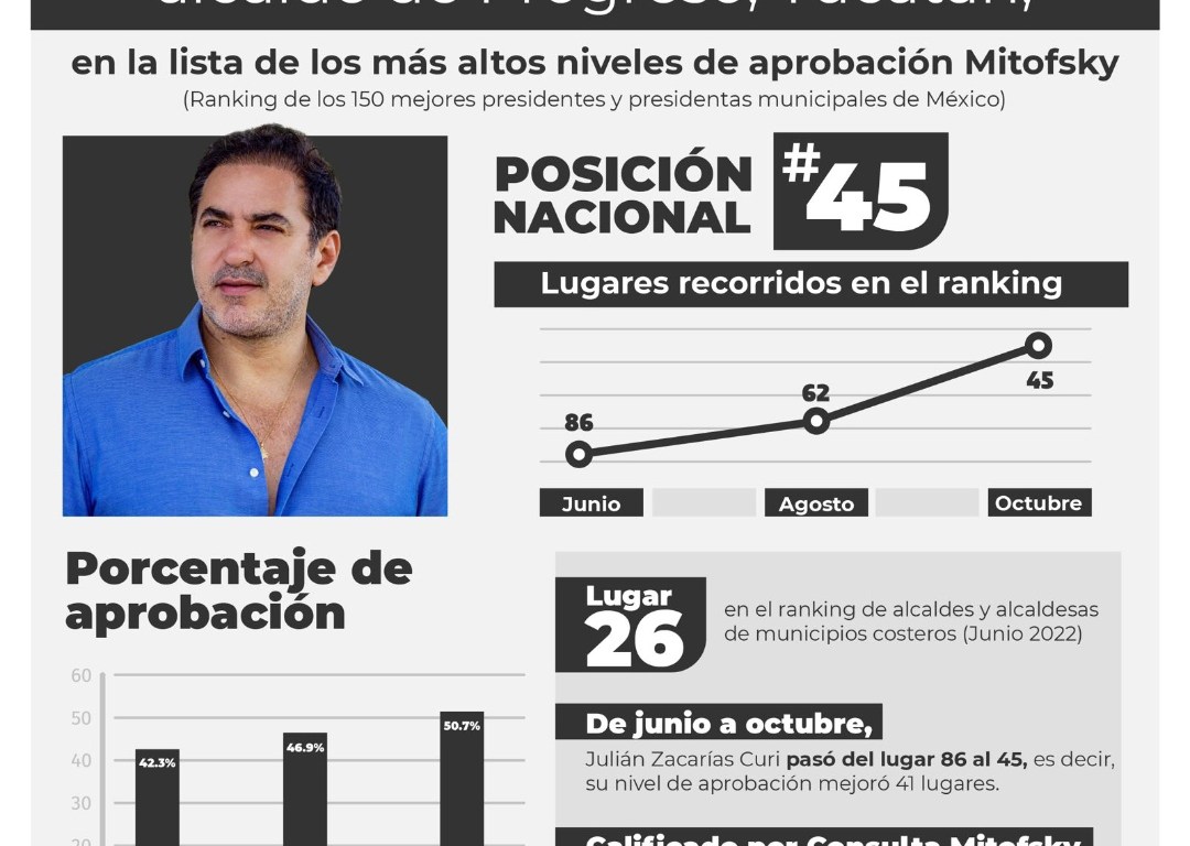 El edil porteño Julián Zacarías muestra un gran crecimiento en sus estadísticas, subiendo del lugar 62 para llegar al lugar 45, recordando que el Alcalde de Progreso se encontraba en el puesto 86 en el mes de junio, a demostrado una correcta gestión con los ciudadanos contando con una aceptación del 50.7%, colocándose entre los mejores 50 Alcaldes de Mexico.