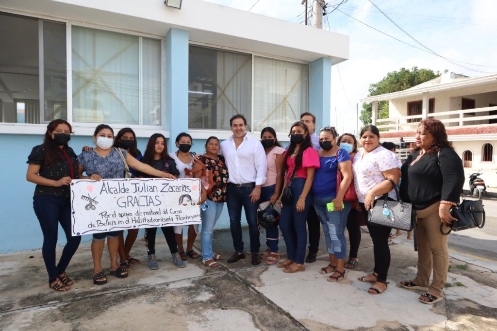 Recibieron los apoyos de manera simbólica Scarlett García Chan, Magdalena Aguilar Hernández, Silvia Ester León Cocón, y Guadalupe Reyes Camacho representantes los talleres de belleza, costura, pintura Textil y manualidades, respectivamente.