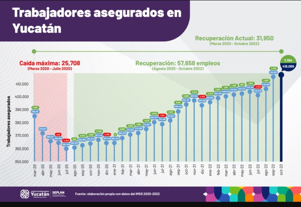 Mérida, Yucatán, 8 de noviembre de 2022.- Yucatán obtuvo un nuevo máximo histórico en generación de empleos, desde que se lleva registro, al alcanzar en octubre pasado la cantidad de 418,066 trabajadores asegurados ante el Instituto Mexicano del Seguro Social (IMSS), crecimiento que se ha mantenido durante 18 meses consecutivos, y a la cual se suma un incremento de 10.7% en el monto del salario diario a trabajadores formales y la generación de oportunidades laborales que impulsa el Gobernador Mauricio Vila Dosal a través de la promoción del estado en los niveles nacional e internacional.