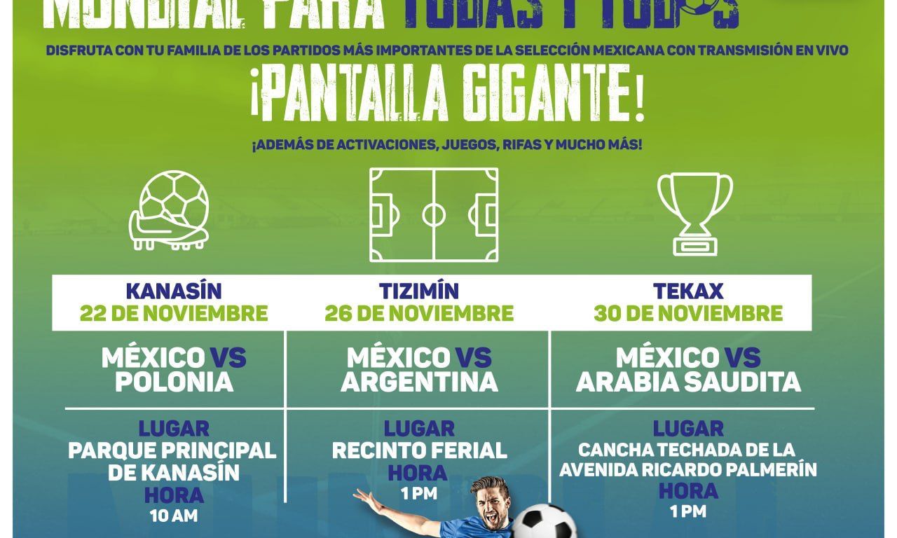 La transmisión de los partidos será de la siguiente forma: el 22 de noviembre, el encuentro México vs Polonia a las 10 de la mañana en la plaza principal del municipio de Kanasín; el 26 noviembre, en Tizimín, se proyectará a la 1 de la tarde el encuentro México vs Argentina en las instalaciones del recinto ferial; en Tekax, el 30 de noviembre a la 1 de la tarde podrán disfrutar de la justa México vs Arabia Saudita en la cancha techada de la avenida Ricardo Palmerín, en el que los aficionados al fútbol vivirán la máxima celebración de este deporte.