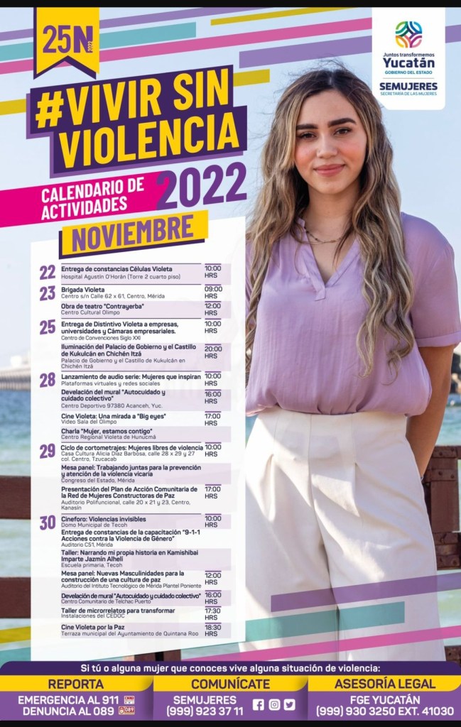 Mérida, Yucatán, 21 de noviembre de 2022.- Con más de 80 actividades gratuitas en municipios y el lanzamiento de una campaña, la Secretaría de las Mujeres (Semujeres) conmemorará el Día Internacional de la Eliminación de la Violencia contra la Mujer, con lo cual busca fortalecer las acciones de prevención, atención y erradicación de esta problemática, prioridad para el Gobernador Mauricio Vila Dosal.