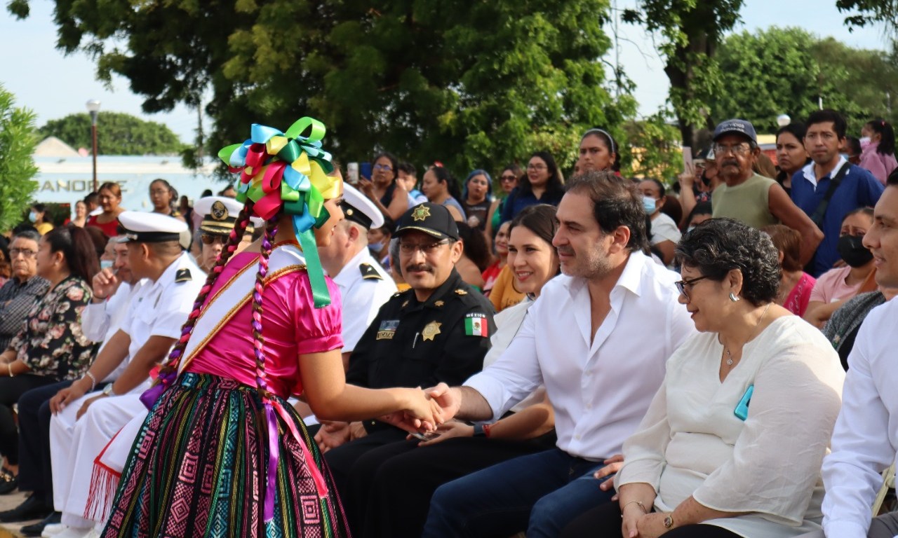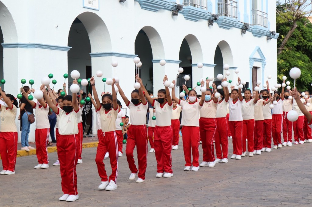 En ese contexto, esta mañana, alumnos de las escuelas primarias «Vicente Guerrero», «Ismael García», «Mártires de Chicago» turno matutino, «Maniobras Marítimas» turno vespertino, «Guadalupe Victoria», «Filemón Villafaña Farfán», «Centro Educativo Mayab», «Juan Miguel Castro»; los Centros de Atención Múltiple número 6 y 14, así como las secundarias «Rafael Cházaro Pérez» y la Técnica Pesquera Número 8, presentaron alegres tablas rítmicas y lo más representativo de nuestro país.