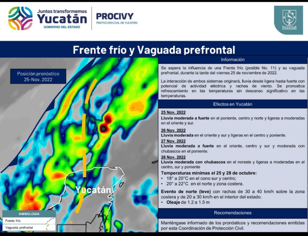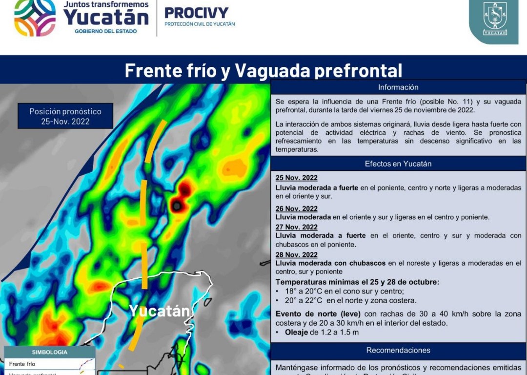 Mérida, Yucatán, 23 de noviembre de 2022.- A partir de este viernes 25, el frente frío 11 y su vaguada prefrontal propiciarán lluvias de ligeras a fuertes, con posibles actividad eléctrica y vientos de hasta 40 kilómetros por hora (Km/h) en la costa, informó la Coordinación Estatal de Protección Civil (Procivy).