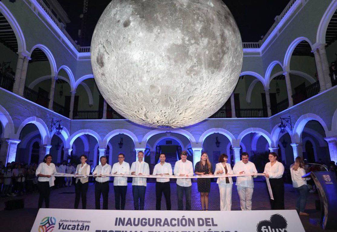 Desde el patio central de Palacio de Gobierno que durante este festival resguarda la pieza “Museum of the moon”, una luna que mide 9 metros de diámetro realizada por un artista de Reino Unido con una impresión real 3D del satélite natural y junto con el Fundador del Filux Yucatán, David di Bona, Vila Dosal realizó el corte de listón inaugural de este evento.