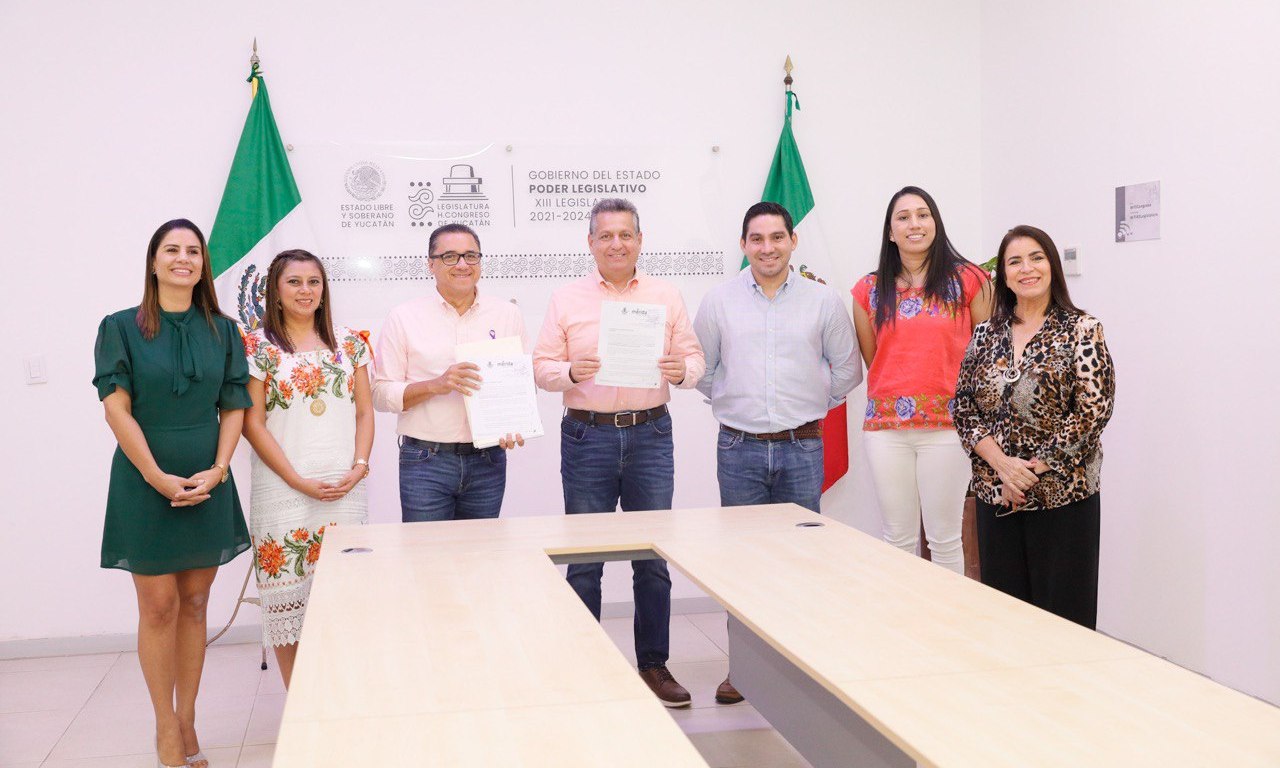 Los funcionarios entregaron el paquete fiscal a Víctor Hugo Lozano Poveda, Diputado Presidente de la Junta de Gobierno y Coordinación Política del Congreso del Estado de Yucatán y Adrián Anguiano Aguilar, secretario general del Poder Legislativo.