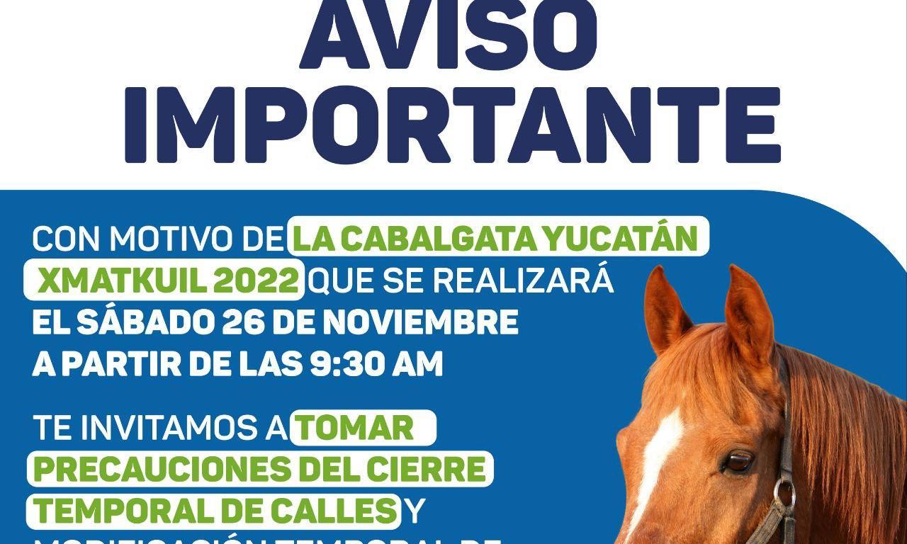 Mérida, Yucatán, 25 de noviembre de 2022.- El Gobierno del Estado, con motivo de la Cabalgata Yucatán Xmatkuil 2022, informa que este sábado algunas vialidades se cerrarán temporalmente a la circulación, principalmente en el oriente y sur de Mérida, por lo que algunas rutas de transporte que circulan en esas zonas modificarán sus derroteros, sin que ello signifique mayores afectaciones a los usuarios.