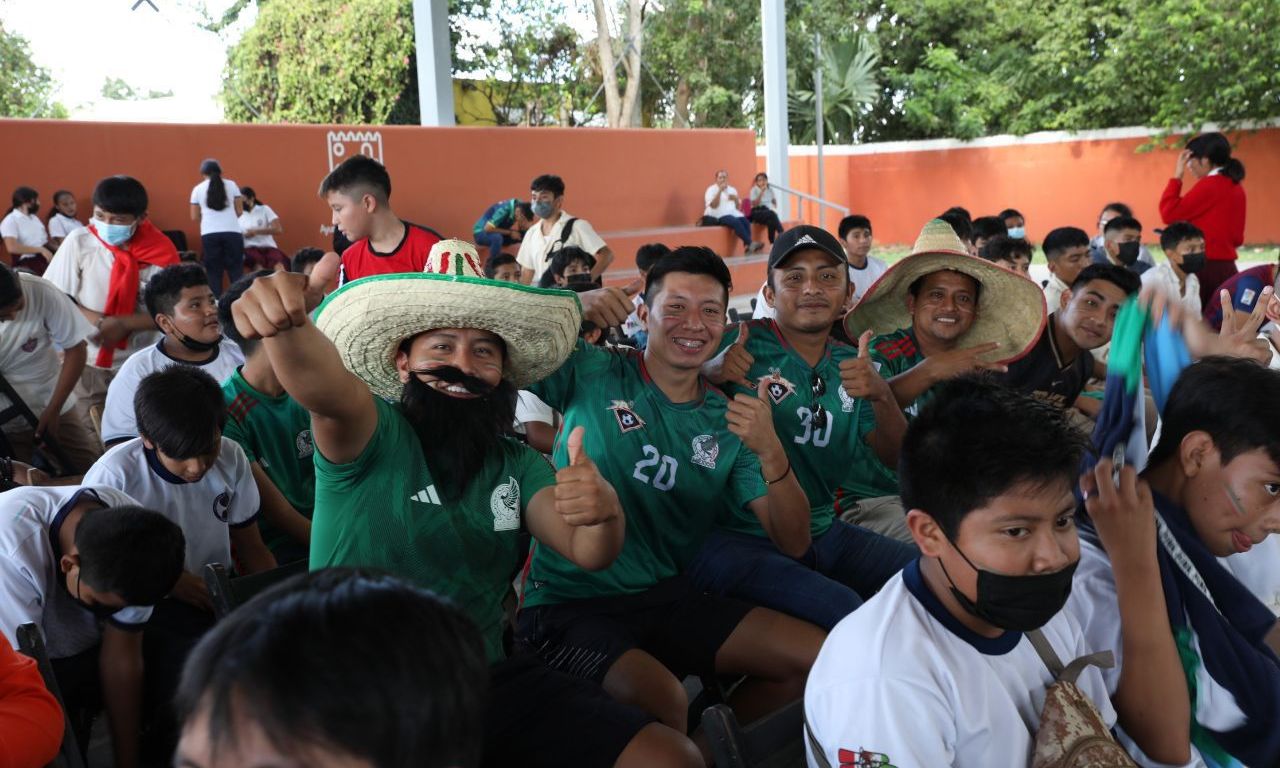 A través de una mega pantalla, los asistentes, quienes portaban la playera oficial para enviar desde Yucatán todo su apoyo a la Selección nacional, pudieron disfrutar de la transmisión del partido de México vs Arabia Saudita, en la cancha techada de la avenida Ricardo Palmerín.