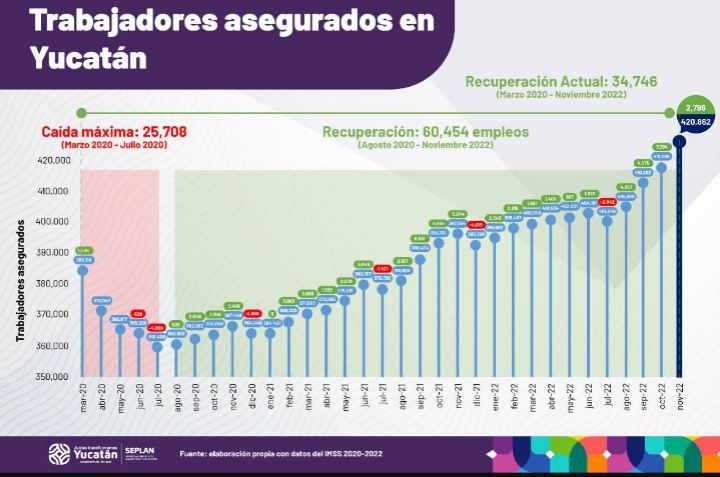 Mérida, Yucatán, 5 de diciembre de 2022.-Resultado de las acciones impulsadas por el Gobernador Mauricio Vila Dosal para promocionar el estado en los niveles nacional e internacional y atraer nuevas inversiones y más empleos, Yucatán obtuvo un nuevo máximo histórico en generación de empleos, desde que se lleva registro, al alcanzar en noviembre pasado la cantidad de 420,862 trabajadores asegurados ante el Instituto Mexicano del Seguro Social (IMSS), crecimiento que se ha mantenido durante 19 meses consecutivos.