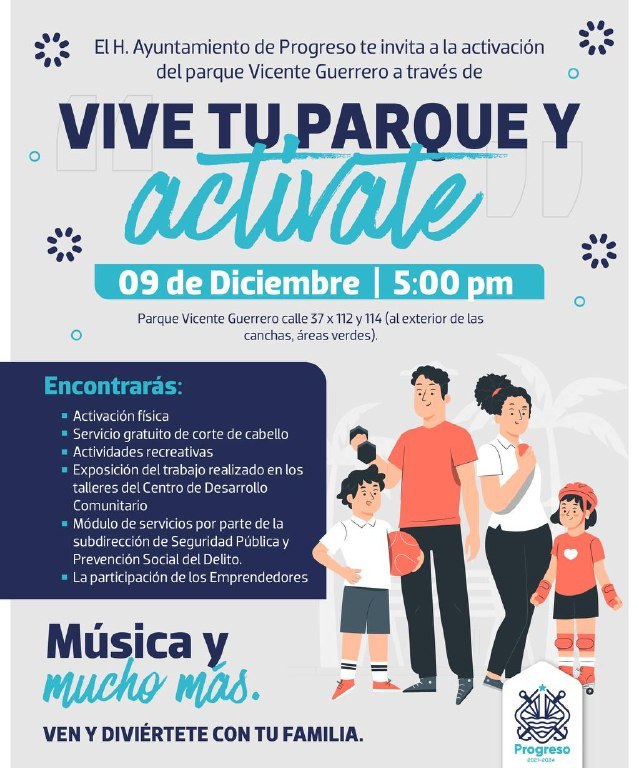 Progreso, Yucatán a 06 de diciembre de 2022. El parque de la colonia Vicente Guerrero será el lugar para que la Dirección de Desarrollo Social acerqué, el próximo viernes 9 de diciembre, diversos servicios y actividades a fin de promover la convivencia familiar asimismo despertar la participación ciudadana, tal como lo ha encomendado el alcalde Julián Zacarías Curi.
