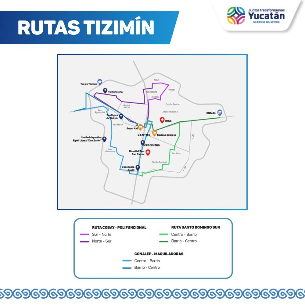 En Tizimín mediante esta estrategia se implementarán 3 nuevos circuitos que integren las rutas que ya existen con los sitios más concurridos de la localidad, las cuales son ruta Cobay-Polifuncional, Santo Domingo Sur y Conalep-Maquiladoras.