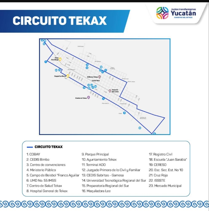 Con el Circuito Tekax se busca ofrecer un derrotero que conecte los puntos de interés más concurridos en unidades modernas y accesibles para personas con discapacidad, además de amigables con el medio ambiente y cuyo estatus podrá consultarse mediante una app para dispositivos móviles.