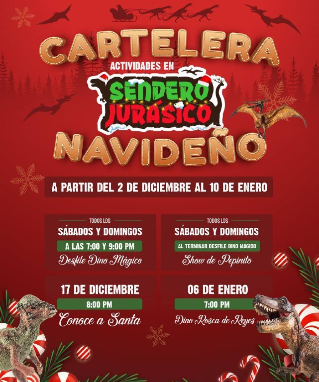 Vale la pena mencionar que en esta lista de actividades, se encuentra la cartelera navideña del Sendero Jurásico, el cual todos los sábados y domingos ofrece a sus visitantes “Desfile Dino Mágico” en dos horarios; 7 y 9 de la noche, y al concluir se presenta el show de Pepinito.