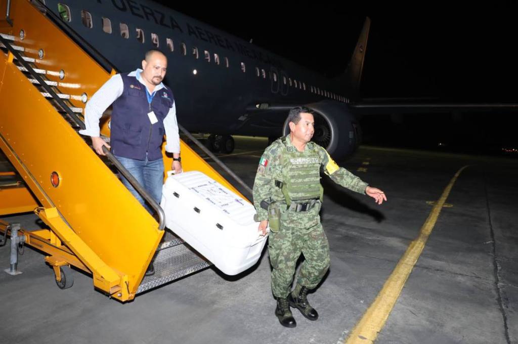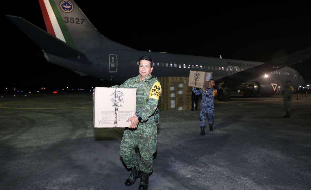 Acompañado del Capitán Segundo de Fuerza Aérea Meteorólogo, Emmanuel Velázquez Trejo y el coronel de Zapadores Óscar Hernández Oviedo, Comandante del Séptimo Batallón de Ingenieros de Combate, el funcionario estatal constató la descarga de los insumos a cargo del personal del Ejército que los colocó en un camión thermoking de la SSY para su traslado al almacén y posterior distribución.