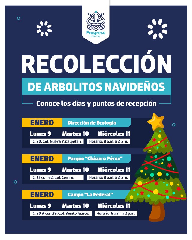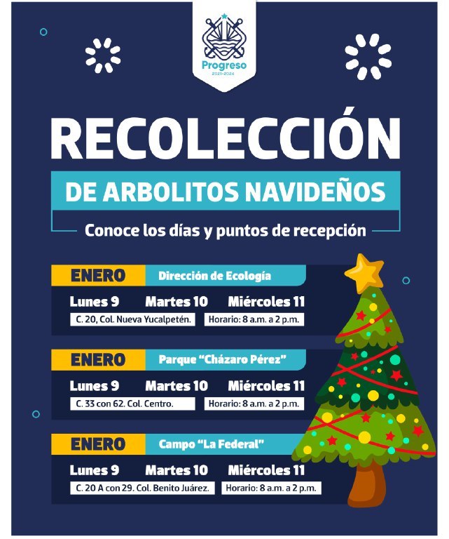Progreso, Yucatán a 07 de enero de 2023. A partir del lunes 9 hasta el miércoles 11 de enero, la Subdirección de Ecología del Ayuntamiento de Progreso, habilitará centros de acopio para la recolección de arbolitos navideños, informó el alcalde Julián Zacarías Curi, resaltando que la finalidad de éstos es para evitar que los árboles terminen en la vía pública y se les pueda dar un destino final adecuado.