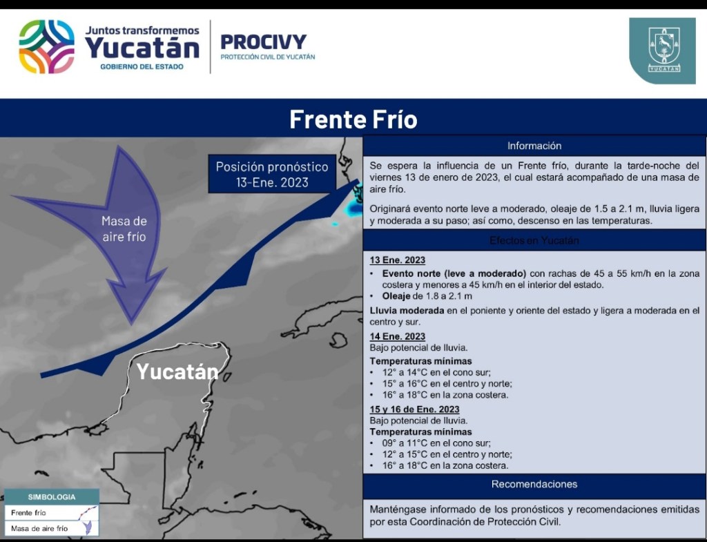 Se trata del décimo de 24 frentes fríos pronosticados para Yucatán, en esta temporada invernal, de la que se da pormenores por instrucción del Gobernador Mauricio Vila Dosal, como parte de las acciones de prevención ante los posibles efectos de la actividad hidrometereológica.
