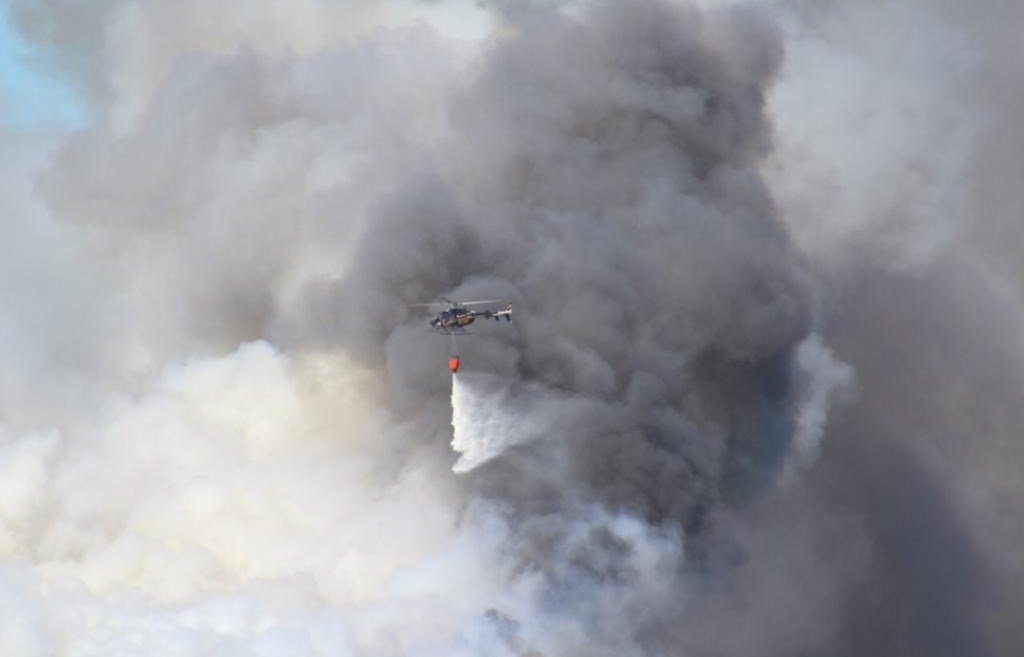 El helicóptero Bell-429 descarga agua sobre el fuego con el heli-balde cada carga es de 700 litros.