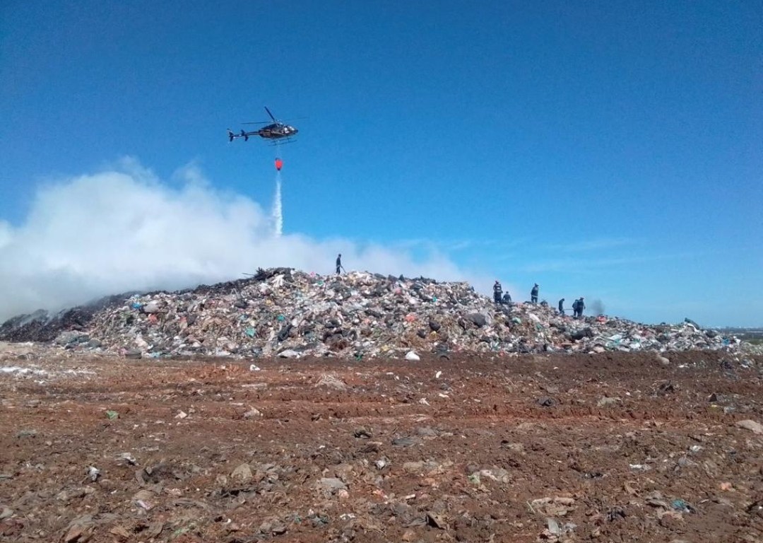 Bomberos de la Secretaría de Seguridad Pública combaten incendio en el relleno sanitario de Mérida.
