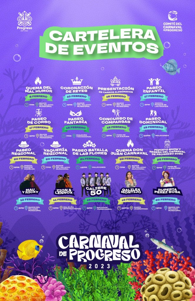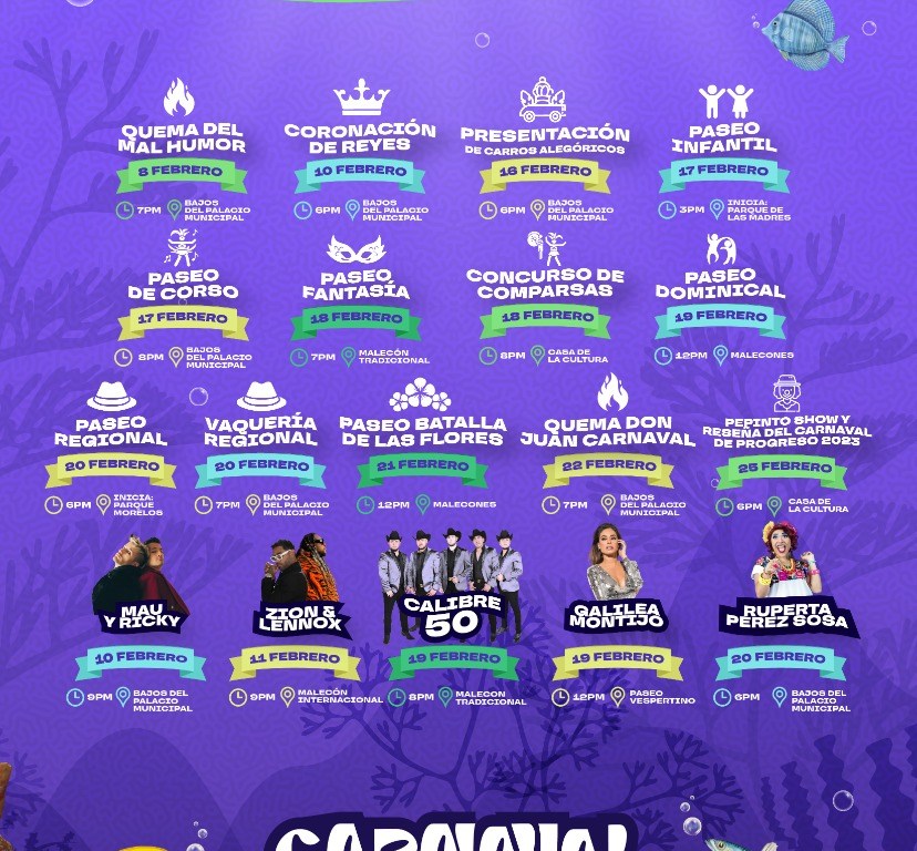 En tanto que el domingo 19 de febrero, se efectuará el afamado paseo dominical en los malecones de Progreso a partir del mediodía y el cual contará con la presencia de la presentadora Galilea Montijo, y que concluirá con la presentación estelar del grupo norteño banda “Calibre 50” a las 8 de la noche al final del malecón tradicional.