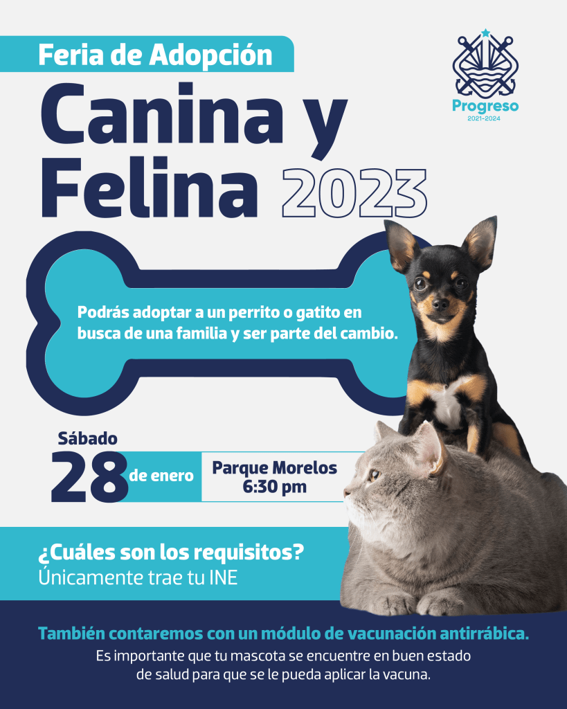Progreso, Yucatán a 27 de enero de 2023. Uno de los compromisos de la actual administración es el cuidado de la fauna del municipio, y las mascotas no son la excepción, por lo que el alcalde Julián Zacarías Curi invita a la ciudadanía a asistir a la “Feria de la Adopción Canina y Felina 2023” y darle una oportunidad a aquellos perritos y gatos que están en búsqueda de un hogar.