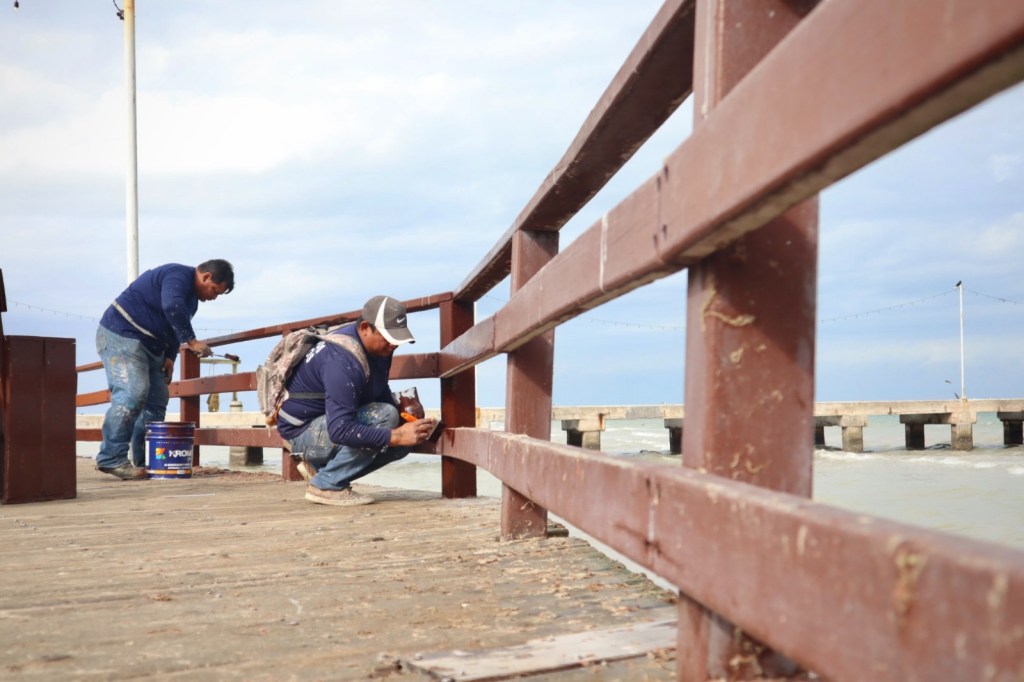 También está la aplicación de pintura en paradores fotográficos y módulo de juegos infantiles del Malecón Internacional, así como en todo el muelle de pescadores, en tanto que en el andador de madera se está rehabilitando el acceso oriente y poniente.