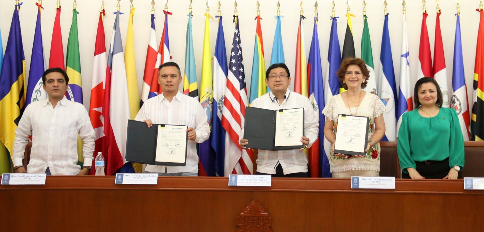 En representación del gobernador Mauricio Vila Dosal, la titular de la Secretaría General de Gobierno (SGG), María Fritz Sierra atestiguó la firma del convenio de colaboración entre el Instituto de Seguridad Jurídica Patrimonial de Yucatán (Insejupy) y la mencionada facultad de la máxima casa de estudios del estado.