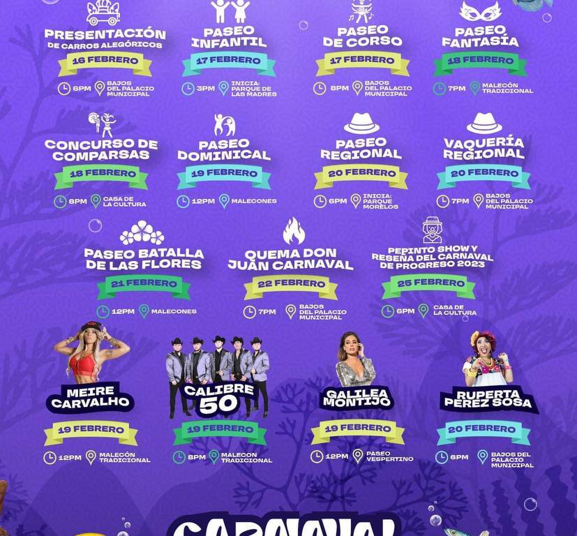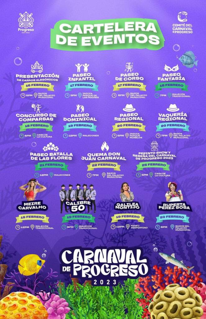 El Comité del Carnaval de Progreso 2023 invita a la ciudadanía a disfrutar de los eventos programados de esta semana, de los que destacan los paseos Infantil, de Fantasía y el Dominical, en este último se contará con la presencia de la conductora de televisión Galilea Montijo, y la presentación del grupo norteño banda Calibre 50 así como de la DJ Marie Carvalho