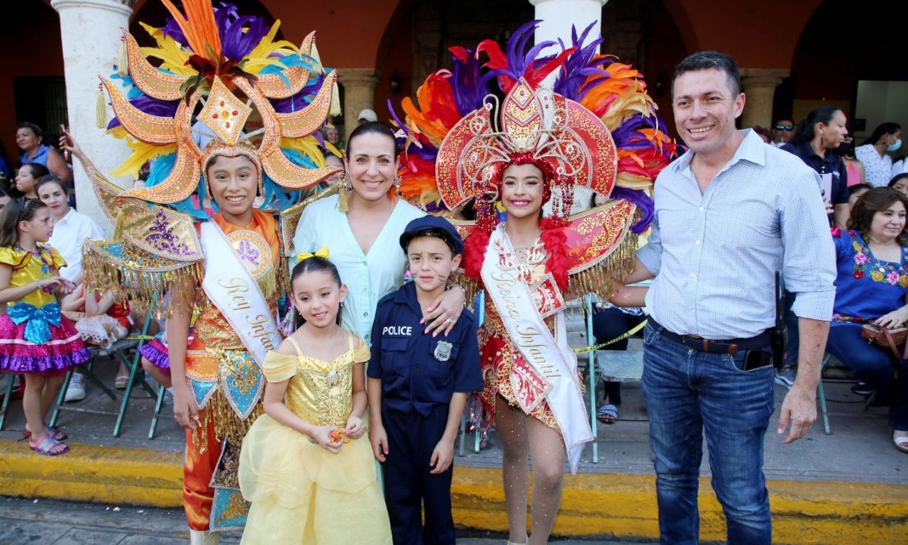 La presidenta del DIF Municipal, Diana Castillo Laviada acompañada de sus hijos Daniela y Renán, y de los reyes del carnaval, Shannon Harris Nic, “Shannon I” y Eddier Rivero Herrera “Eddier I”, disfrutó de los alegres bailes y los vistosos trajes multicolores con que los niños y las niñas desfilaron al ritmo de música pegajosa ante la mirada divertida de miles de familias que desde temprano se dieron cita para disfrutar del desfile infantil de comparsas.