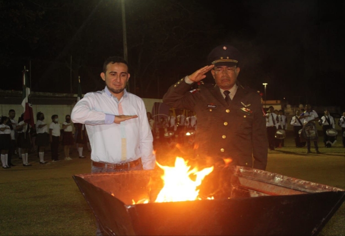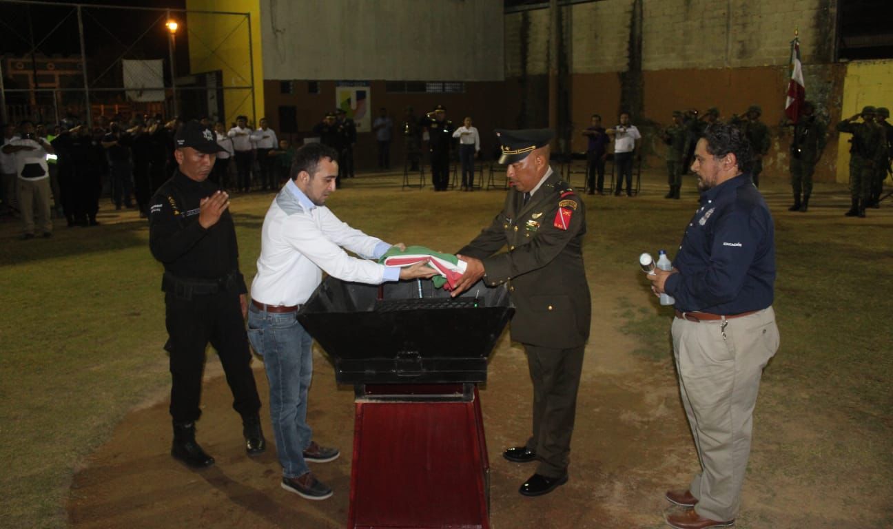 Al sonido de las trompetas y los tambores el alcalde junto al Teniente Coronel de Infantería Miguel Angel Santiago Juarez procedieron a la incineracion de las banderas, en acto seguido el Coronel de Fuerza Área Piloto Aviador, Hilario Feliz Santiago Hernández dió lectura a la toma de protesta de abanderamiento.