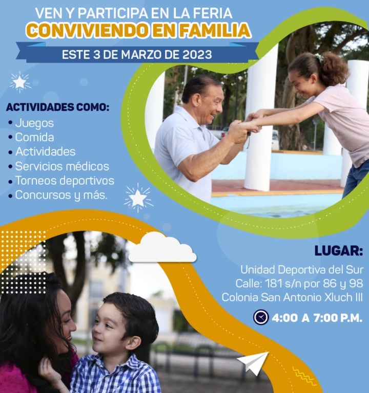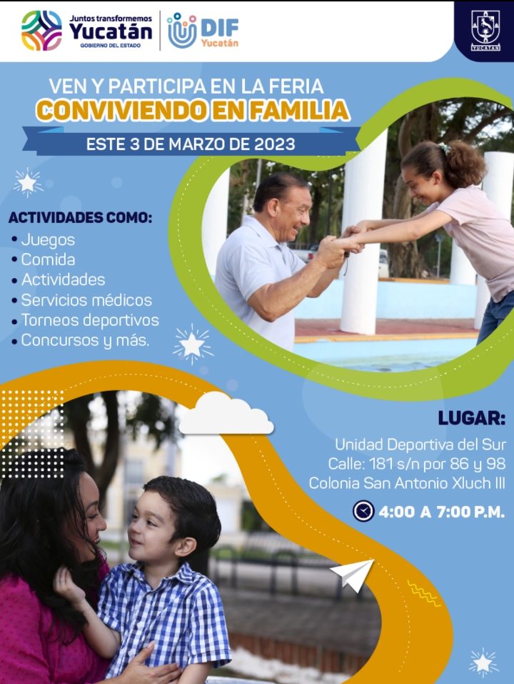 Mérida, Yucatán, 28 de febrero de 2023.- Con el objetivo de impulsar espacios de convivencia, conforme a instrucciones del Gobernador Mauricio Vila Dosal, el Sistema para el Desarrollo Integral de la Familia (DIF) Yucatán invita a la feria Conviviendo en Familia 2023, que se realizará este viernes 3 de marzo, de 15:30 a 19:00 horas, en la Unidad Deportiva del Sur.