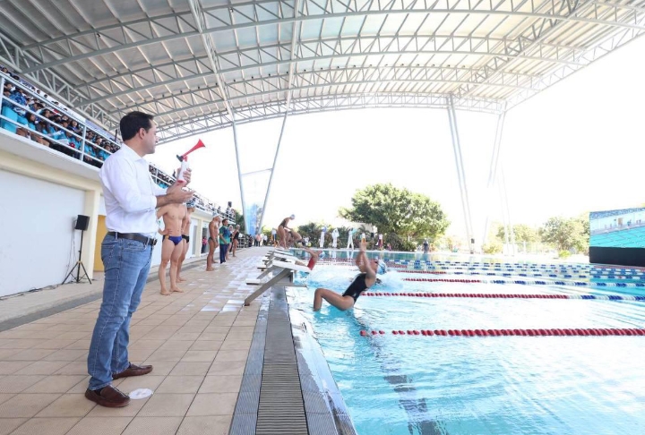 Ante las nadadoras Ana Sofía Lara Loria, Regina Palafox Jiménez y el clavadista Owen Mendieta, el Gobernador recordó que hace unas semanas hizo lo mismo con el remodelado Centro de Alto Rendimiento (CARD); este año y el siguiente, se mantendrá las intervenciones a los recintos del rubro en la entidad, a fin de ofrecer a la niñez y juventud espacios para actividades físicas.