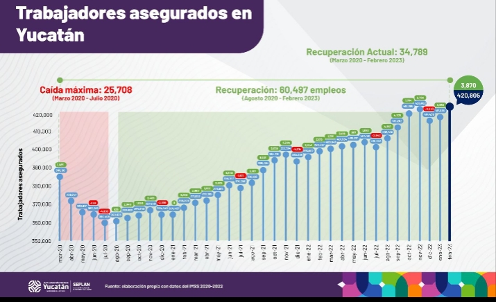 Mérida, Yucatán, 8 de marzo de 2023.- Yucatán supera un nuevo récord en generación de empleos al registrar en febrero de este año a 420,905 trabajadores asegurados ante el Instituto Mexicano del Seguro Social (IMSS), cifra máxima alcanzada en la entidad desde que se lleva registro superando el récord registrado en noviembre de 2022 que fue de 420,862, resultado de la fuerte proyección nacional e internacional del estado que impulsa el Gobernador Mauricio Vila Dosal para atraer más inversiones y empleos que beneficien a las y los yucatecos.