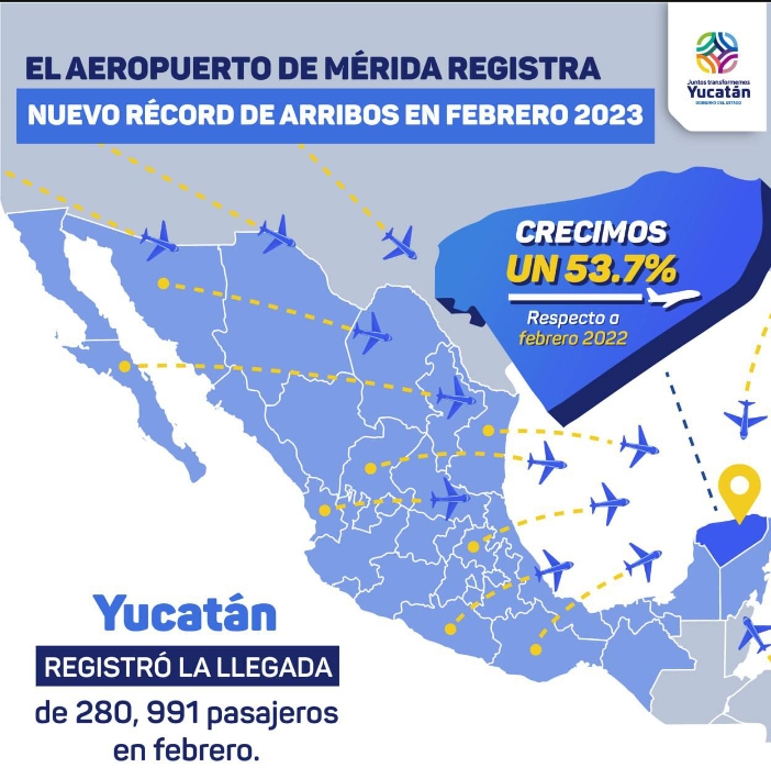 Mérida, Yucatán, 10 de marzo de 2023.- El de 2023 ha sido el mejor febrero en la historia de Yucatán en movimiento de pasajeros, pues el Aeropuerto Internacional de Mérida “Manuel Crescencio Rejón” registró 280,991, lo que significó un crecimiento de 53.7% respecto del mismo periodo de 2022 y refleja el buen trabajo que el Gobierno de Mauricio Vila Dosal realiza para promover a Yucatán, en el país y a nivel mundial.