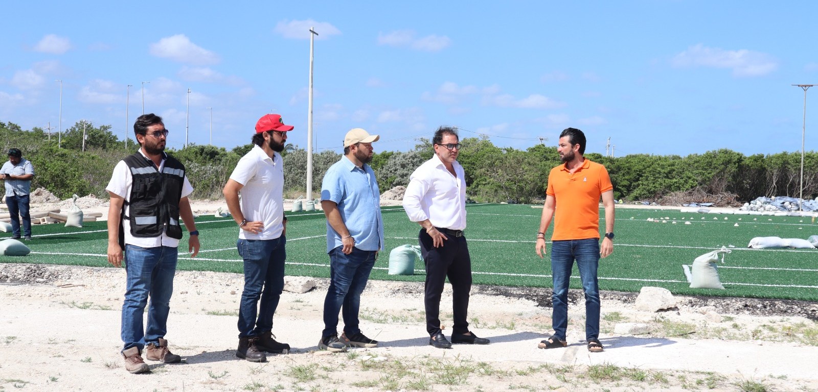 27 de marzo de 2023. El alcalde Julián Zacarías Curi, acompañado del director de Obras Públicas municipal, Luis Castro y el dueño de Urbamex, Carlos Blanco, visitó la Unidad Deportiva Progreso para supervisar el avance de las obras que se están llevando a cabo.