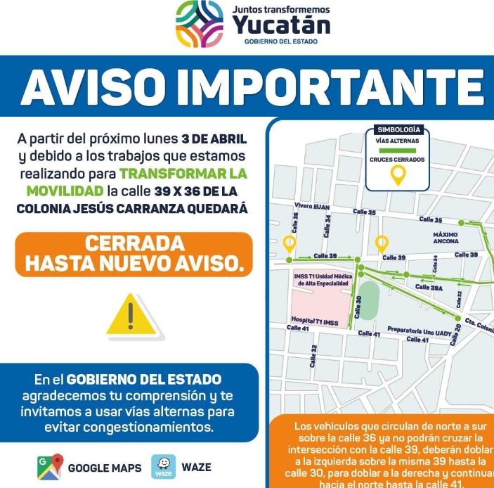 -El Gobierno estatal informó que a partir de las 10 de la noche del próximo lunes 3 de abril se restringirá el paso vehicular en las intersecciones de las calles 39 con 36 de la colonia Jesús Carranza y de la calle 39 por 28 de la colonia Máximo Ancona.