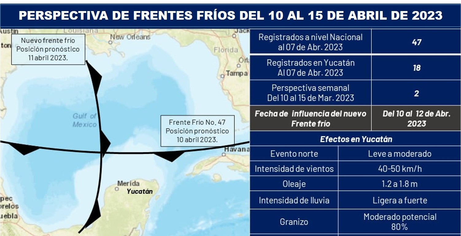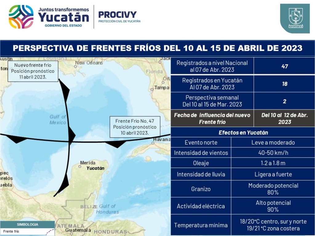 Con datos también del Servicio Meteorológico Nacional (SMN), precisó que entre los días 10 y 12 de abril se espera un aumento gradual en el potencial de lluvia, como efecto, primeramente de la cercanía del Frente Frío No. 47 al ubicarse éste en el Golfo de México, al norte del Estado, pero que posteriormente potenciará sus efectos al ser reforzado o sustituido por un nuevo sistema frontal, que se desplazará sobre el Territorio Yucateco. Dichos sistemas, propiciarán, el día 10 de abril, lluvias ligeras y ocasionalmente moderadas en el norte del Estado, que al día siguiente se intensificarían a moderadas en el poniente y centro y fuertes en el oriente y sur de la entidad, acompañadas de actividad eléctrica. Para el día 12 de abril, disminuyen sus efectos a lluvias ligeras.