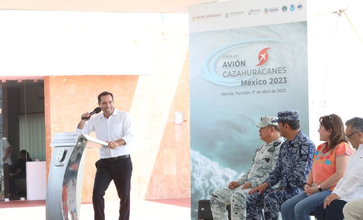 Desde el Aeropuerto Internacional de Mérida, el Gobernador encabezó el inicio de la gira 2023 de esta aeronave estadounidense por México y el Caribe, evento donde estuvo acompañado de la coordinadora del Servicio Meteorológico Nacional y representante de la Comisión Nacional del Agua (Conagua), Alejandra Méndez Girón y del director interino del Centro Nacional de Huracanes de la Agencia Científica de Administración Nacional Oceánica y Atmosférica de los Estados Unidos de América (NOAA por sus siglas en inglés), Jamie Rhome.