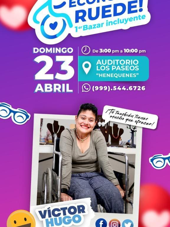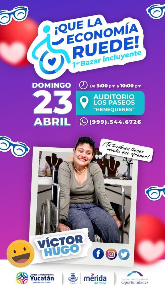 Mérida, Yucatán, 21 de abril de 2023.- Con la participación de 60 emprendedores y bajo el lema “¡Que la economía ruede!”, este domingo 23 se llevará a cabo el Primer Bazar Inclusivo en Paseo Henequenes de Francisco de Montejo, un evento en el que habrá expositores con algún tipo de discapacidad y espacios con accesibilidad universal para que todos puedan asistir.