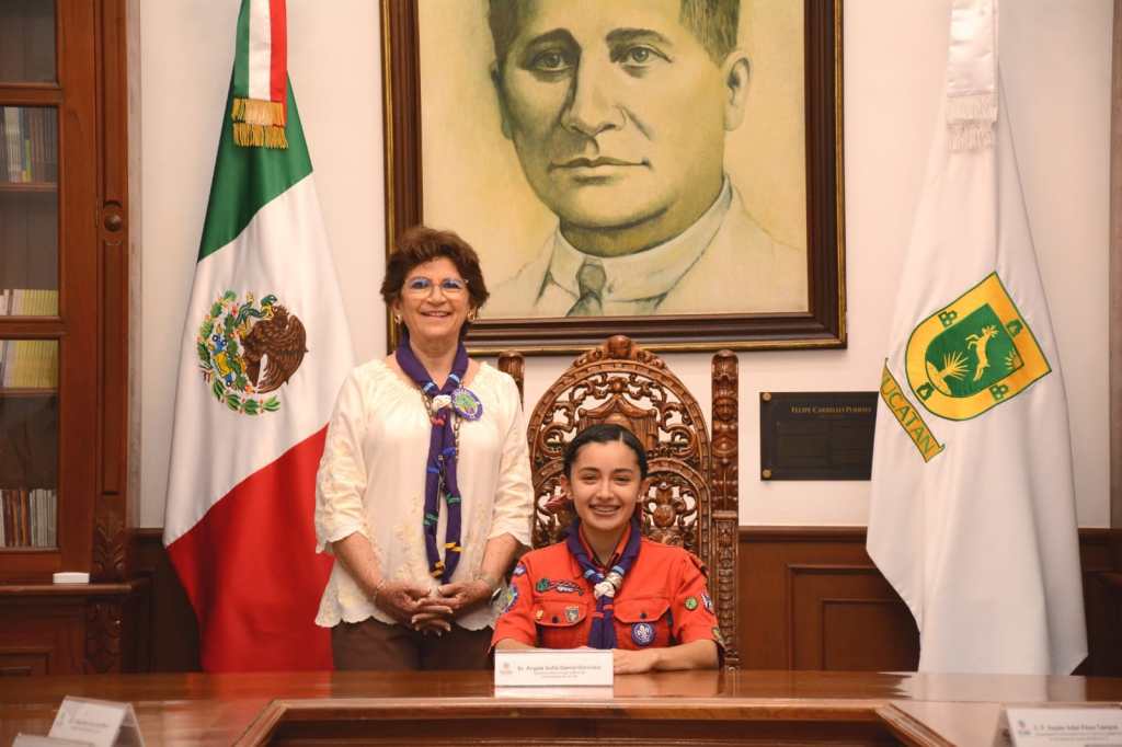 Mérida, Yucatán, 12 de mayo de 2023.- En reconocimiento a su esfuerzo, compromiso y labor social de fomentar hábitos saludables para el bienestar de las niñas y los niños, la titular de la Secretaría General de Gobierno (SGG), María Fritz Sierra dio posesión a la joven scout, Ángela Sofía García Gorocica como “Gobernadora por un día”, en una ceremonia realizada en el marco de la Semana Scout 2023.