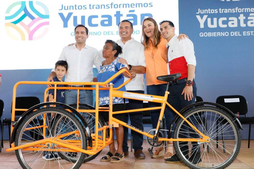 Una de las beneficiarias de la vertiente productivo es Ligia María Dzul Canul, quien se dedica a la venta en diferentes tianguis de la ciudad y recibió de Vila Dosal un triciclo que le permitirá transportar su mercancía más fácil y sin tanto gasto, puesto que antes se veía en la necesidad de pagar el servicio de un mototaxista.