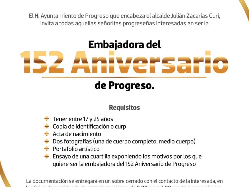 De la misma manera, también se invita a todas aquellas señoritas interesadas en ser la Embajadora del 152 Aniversario de Progreso a presentar su documentación con datos de contacto en la oficina de presidencia del palacio municipal, de 9 a 14 horas de lunes a viernes.