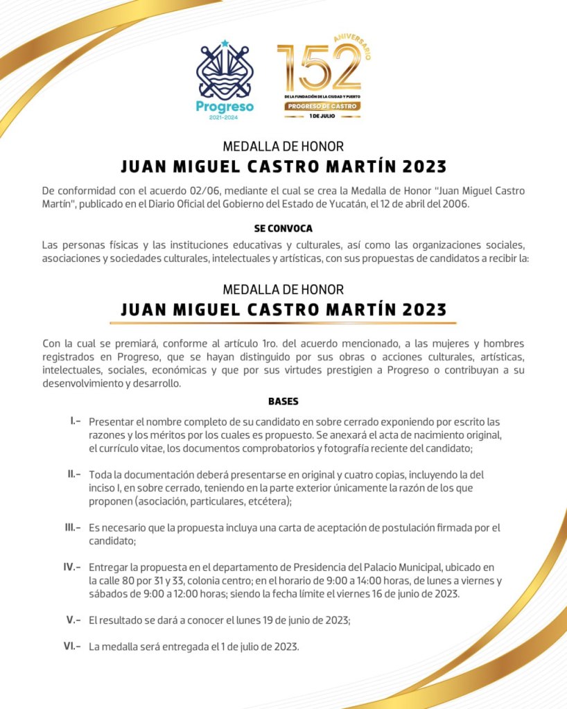 Como es tradición, la medalla de honor “Juan Miguel Castro Martín” será entregada el día 1 de julio, en el marco de los festejos del 152 Aniversario de la fundación del municipio. Para ser electo, es requisito ser una persona que se distinga por sus obras o acciones, ya sean culturales, artísticas, intelectuales, sociales, económicas o, que por sus virtudes, prestigie a Progreso o contribuya a su desenvolvimiento y desarrollo.