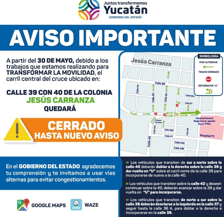 Mérida, Yucatán, 30 de mayo de 2023.- Como parte de los trabajos para continuar avanzando en la transformación a la movilidad en el estado, el carril central del cruce ubicado en la calle 39 con 40 de la colonia Jesús Carranza se mantiene cerrado desde hoy y hasta nuevo aviso, por lo que se invita a la ciudadanía a tomar previsiones.