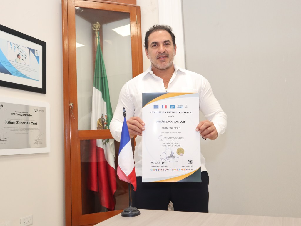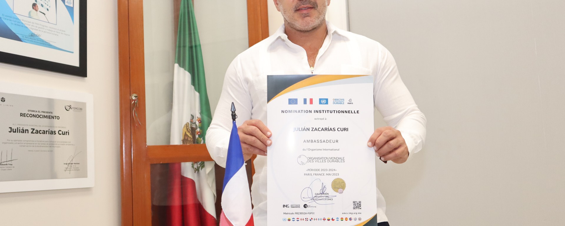 Progreso, Yucatán a 8 de junio de 2023. El alcalde Julián Zacarías Curi recibió el nombramiento de Embajador de la Organización Mundial de Ciudades Sostenibles en el marco del 7° Foro Global de Ciudades Sostenibles que se llevó a cabo en París, Francia del 23 al 26 de mayo del presente año. El anuncio de dicha designación estuvo a cargo del presidente del Instituto Mejores Gobernantes AC, Galo Limón y del Vicepresidente del Institut pour la Bonne Gouvernance, Nicolás Alexandre Condom.