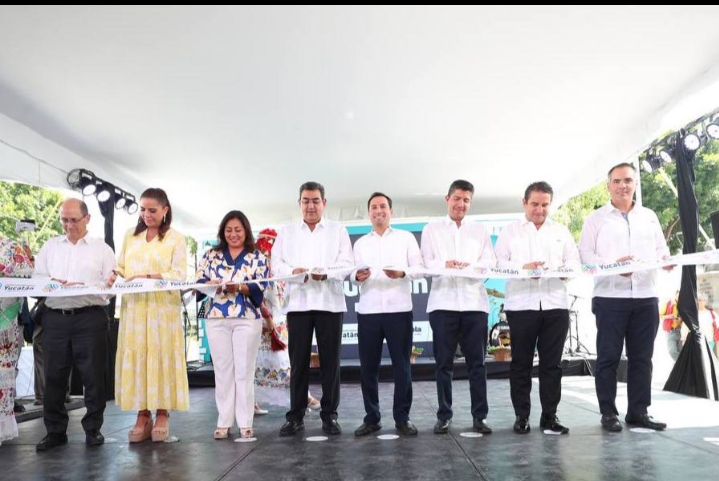 Desde el Parque del antiguo barrio del Carmen de esta ciudad, ambos Gobernadores, acompañados del alcalde anfitrión, Eduardo Rivera Pérez, cortaron el listón inaugural de esta colorida exhibición, en la que participan 82 micro, pequeñas y medianas empresas yucatecas.