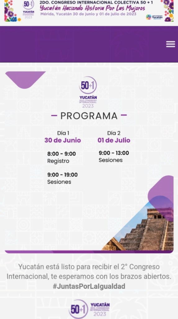 Mérida, Yucatán, 19 de junio de 2023.- La Colectiva 50+1 anunció las fechas de su Segundo Congreso Internacional, que se llevará a cabo en Yucatán los días 30 de junio y 1 de julio de 2023, teniendo como sede el Centro Internacional de Congresos (CIC) de esta ciudad, en el que se contará con la participación de cientos de mujeres líderes en distintos ámbitos y cuyo acto inaugural será encabezado por el Gobernador Mauricio Vila Dosal.