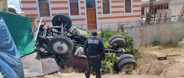 Según comentó el conductor, estaba realizando maniobras para meter materiales de construcción, cuando vehículo se va a una hondonada, volcando sobre su costado derecho.